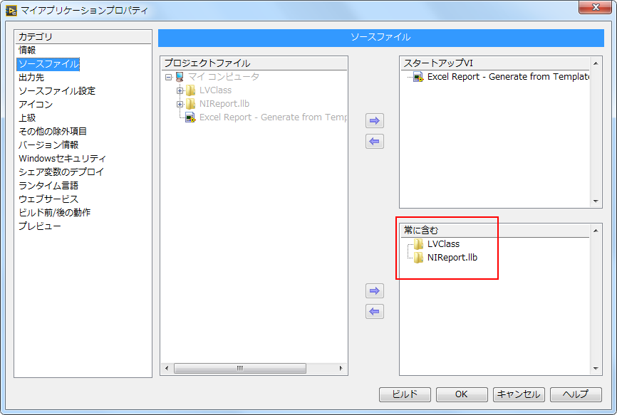 - LabVIEWプロジェクトに2つのフォルダができたら、ビルド仕様を右クリックして、新規>>アプリケーション(EXE)からアプリケーションプロパティで下図のようにソースファイルカテゴリの常に含むリストボックスへ追加します。