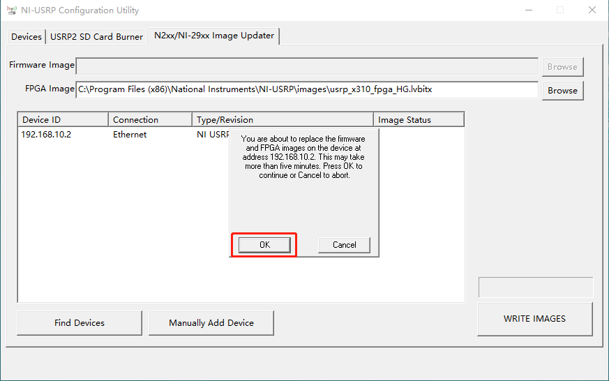 1. 장치를 업데이트 하려면 이미지 쓰기 버튼을 클릭합니다. 확인 및 경고 대화 상자가 표시됩니다. 선택 사항을 확인하고 계속하려면 확인을 클릭합니다.