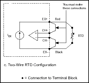 La forma más sencilla de tomar una lectura de temperatura con un RTD es utilizando el método de dos cables; sin embargo, la desventaja de este método es que si la resistencia del conductor en los cables es alta, el voltaje medido, VO, es significativamente más alto que el voltaje que está presente en el RTD mismo. El NI 9217 no admite configuraciones de medición de dos cables.