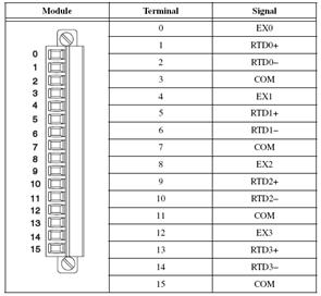 La Figura 5 muestra las conexiones externas para la medida, así como los pines para el módulo NI 9217 RTD. El positivo de excitación está conectado a RTD0 + porque el NI 9217 lo conecta internamente al terminal de excitación.