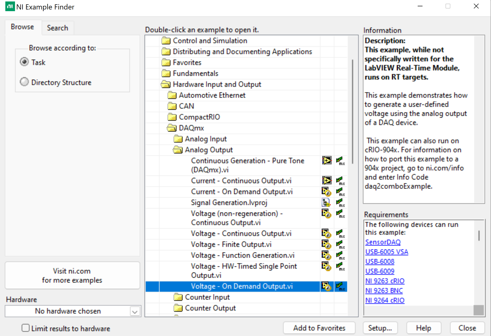 2. 在 NI 范例查找器窗口中,导航至硬件输入与输出>> DAQmx >>模拟输出>>Voltage - On Demand Output.vi 。